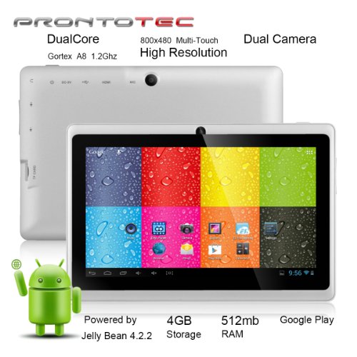 Product Name - ProntoTec Q8 7 inch Dual Core Tablet PC CPU - Cortex A8 Dual Core 1.2 GHz Operating System - Android 4.4 KitKat Touch Screen - 7-Inch Capacitive Display - 800 x 480 Pixels Internal Storage - 4GB GB RAM - 512MB SDRM DDR3 Sensors - G-Sensor Wireless and Cellular - Wi-Fi (802.11 BGN) - Support for 3G Dongles and Ethernet with Adapter Dual Cameras - Front 0.3M/Rear 2M - VGA up to 30 fps with Audio Power and Battery - Built-in 2800mAh Rechargeable Lithium Battery - Run Time (Up to): 3 Hours - Power Device Type: AC Adapter - Voltage Required: 100-240V Input/Output - Micro USB Port - 3.5-mm Stereo Headphone Jack - Built-in Speaker - Microphone - Micro SD card slot - DC Input Jack - HDMI Support Format - Video: MP4, AVI, MKV, 3GP, RMVB, RM - Audio: AVI, MOV, MP4, RMVB, FLV, MKV - Picture: GIF, JPG, JPEG, PNG, BMP, WBMP, WEBP - EBOOK: TXT, PDF Accessories - User Manual - Charger - USB Cable $109.98 |
